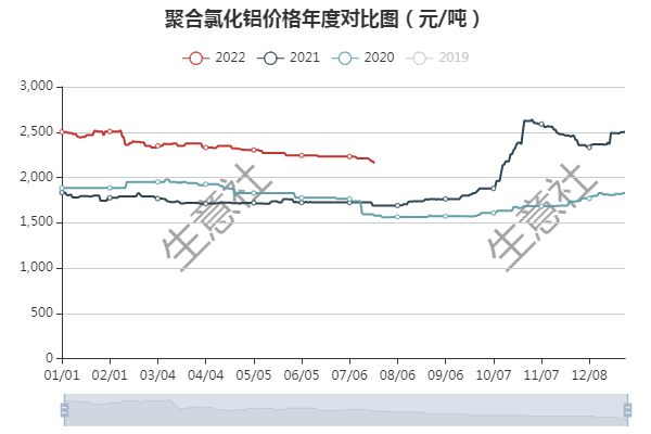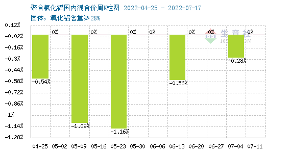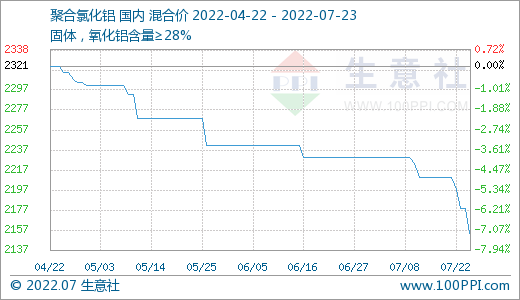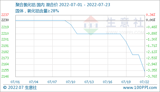 如图所示,生意社监测数据显示,本周(7月18-22日)聚合氯化铝国内行情震荡下调2.55%,固体(工业级,含量≥28%)聚合氯化铝周初主流报价2210元/吨,周末主报2153.75元/吨。国内厂家生产正常,现货库存充足,成本支撑不足、需求寡淡,市场心态偏空,部分厂家降价促成交。