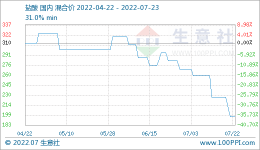 产业链:上游原料方面,盐酸:生意社监测数据显示:本周(7月18-23日)国内盐酸市场均价由226.67元/吨跌至196.67元/吨,跌幅13.24%。较去年同期,同比下跌14.49%。从厂家报价来看,本周国内盐酸市场价格暂稳。从盐酸上下游产业链来看,上游液氯市场行情近期小幅下跌,成本支撑一般,下游行情偏空、采购积极性减弱,分析认为盐酸近期小幅震荡下跌为主。