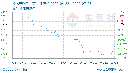 生产过程中用到液化天然气。生意社数据监测显示,7月18日国内液化天然气均价为5802元/吨,7月22日国内液化天然气均价为6110元/吨。本周原料气竞拍价格上调,给液化天然气有利支撑。国外气的连续上涨,也带动了国内液化天然气的持续上调。下游买涨不买跌心态下,对天然气补货意愿增加。分析认为,近期液化天然气市场走势集中走高,行情向好运行。需求释放良好情况下,低价液厂或继续上调价格,预计短期内液化天然气价格继续上行为主。